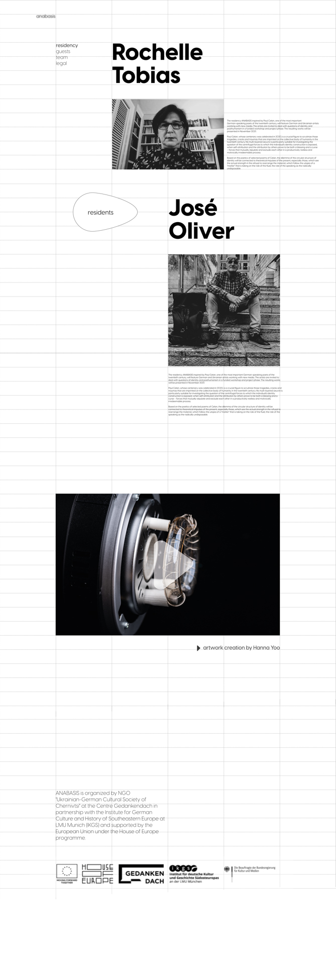 The Anabasis residency The ANABASIS residency was implemented by Ukrainian-German cultural сenter Gedankendach in Chernivtsi. Residency itself was inspired by Paul Celan, one of the most important german-speaking poets of the 20’ century and supported by the House of Europe. During the residency artists were invited to deal with questions of identity and posthumanism. They were taking part in workshops and were preparing their projects during the active phase of the residency. Those projects were presented on a website, developed by us in November 2021. Our studio was creating the visual identity for the residency and online gallery in form of the web site [anabasis.residency]